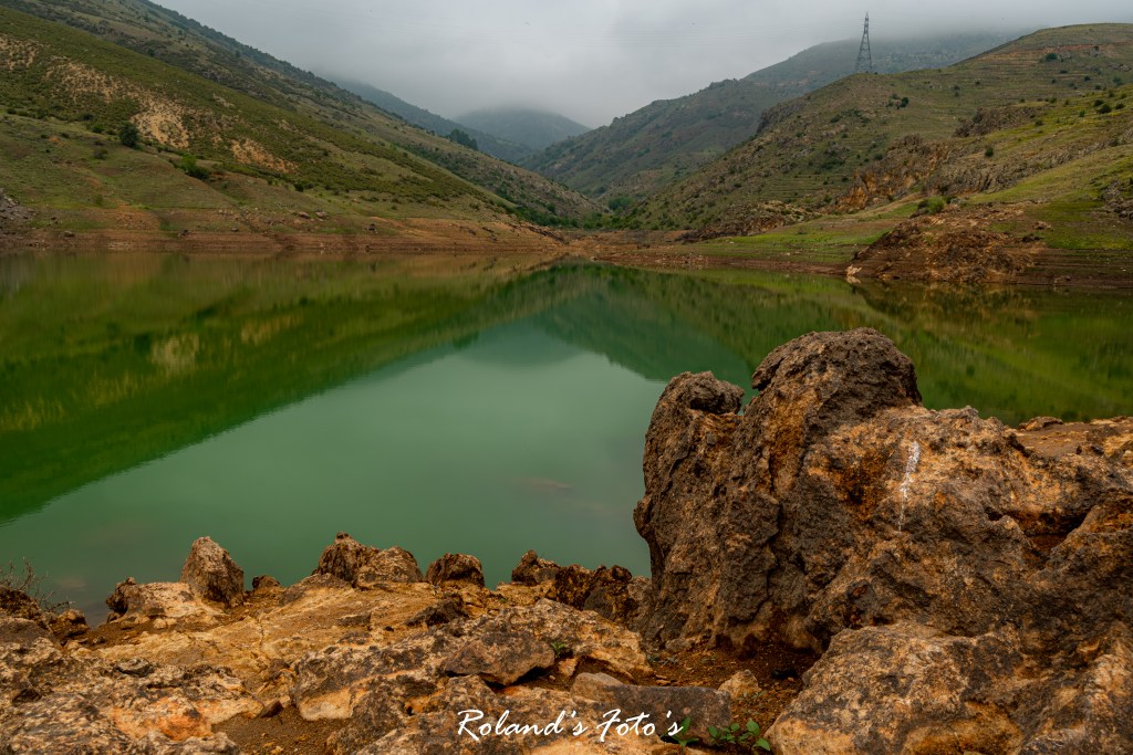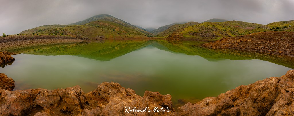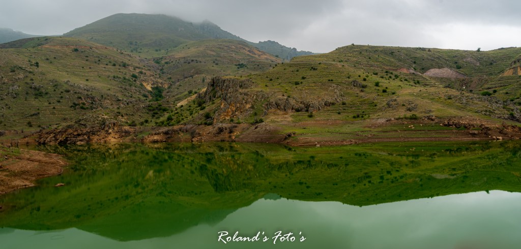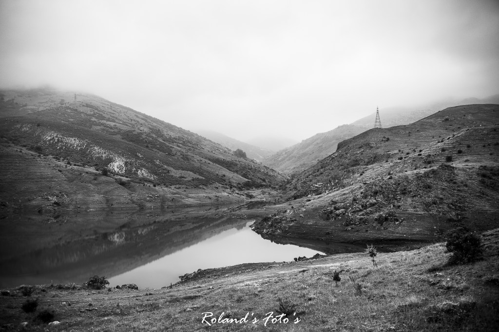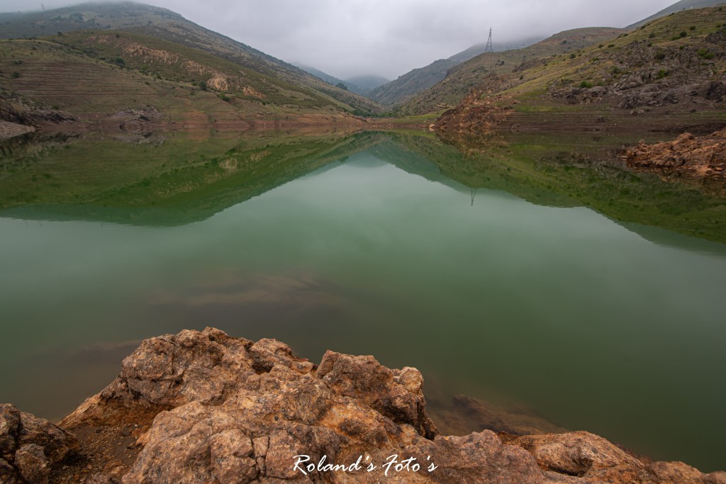Selma vroeg mij heel lief of we nu alsjeblieft weer terug konden. Ze vond het allemaal niet zo leuk. “Ach lieverd, het komt allemaal goed. Vaak ben je te bang hè….” Dus zelf er niet helemaal op berust maar we gingen verder, richting Sandıklı in de hoop dat als we weer lager kwamen het zicht wat zou verbeteren. Nou…. het leek er op dat we tot helemaal beneden met onze hoofden in de wolken zouden zitten. Maar toen…. er was licht hahahaha we konden weer wat zien. We zaten onder de wolken. En het eerste wat we zagen was een meertje. Althans, op het eerste gezicht een meertje. Maar na later bleek een stuwmeertje. Maar dit was niet meer in gebruik als stuwmeer. Dus de natuur kreeg er de vrije hand. Dus nu Selma wat meer relaxt was konden we stoppen om te fotograferen.