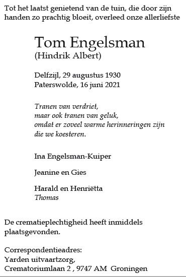 Ik zeg goedemorgen en Günaydın. Laat ik eerst maar eens beginnen met een verdrietig berichtje. Onze laatste twee huizen zijn verkocht door een uiterst kundig makelaar, dhr Harald Engelsman. En naast een kundig makelaar is het ook een uiterst plezierig mens. Onze ontmoeting was er een uit het hoofdstuk van die vergeet ik nooit meer. Hij stond bij ons aan de Nijstukken in Assen aan de deur, stelde zich voor als Harald Engelsman en het eerst wat ik vroeg was “heb jij misschien een familielid die Engelse les geeft” Achteraf dacht ik nog van dat als dit niet zo zou zijn, het een uiterst flauw grapje zou geweest kunnen zijn. Maar toen hij dit bevestigde was de link snel gelegd. Zijn vader had mij 4 jaar lang Engelse les gegeven op de Harm Jan Zondagschool in Groningen. Een leraar van de oude stempel. Hij gaf les in Brits Engels en niet in Amerikaans Engels want dat vond hij verschrikkelijk. Een memorabele man. Achteraf had ik een enorm respect voor hem, ik geef het je te doen… les geven aan al die opgroeiende pubers. De wildste verhalen gingen er rond over hem. Een grappige anekdote die ik me herinner was dat tijdens een zogenoemde “ouderavond” (wie kent ze nog…) werden mijn ouders ‘ontboden’ bij dhr Engelsman, er moest even gesproken worden over Roland… Nou, mijn vader had geen tijd (of geen zin hahaha) dus mijn moeder ging naar hem toe. “Nou mevrouw Tel, het gaat niet goed met Roland. Hij zit meer bij de meisjes op schoot dan dat hij aandacht heeft voor mijn lessen” En mijn moeder gaf toen een epische reactie…. “Ik heb liever dat hij bij de meisjes op schoot zit dan bij jongens” Meneer Engelsman schudde zijn wijze hoofd en het gesprek was ten einde. Maar goed, meneer Engelsman is niet meer…. woensdag 16 juni is hij overleden op de mooie leeftijd van 90 jaar, 29 augustus zou hij 91 zijn geworden. Ik heb gisteren nog contact gehad met wat oud klasgenoten en dan komen de verhalen wel los. Een paar jaar geleden hebben we nog een grote reünie georganiseerd, en meneer Engelsman wilde niet komen. Typisch meneer Engelsman. Het was dat zijn vrouw zich er tegenaan ging bemoeien dat hij er uiteindelijk toch was. Rust zacht meneer Engelsman….