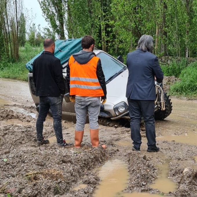 Toen Selma en ik gingen kijken zag je aan de man dat hij blij was dat er eindelijk hulp was. (nou ja… hulp hahahaha) Snel stopte er ook twee wat euhm…. laten we zeggen, twee seniore heren. Die wisten de oplossing. Niet moeilijk doen, zij gingen op de hoge kant van de auto staan en dan kon, volgens deze mensen ‘het slachtoffer’ rustig weg rijden. Tja, en behalve een modderig pak van deze twee hulpvaardige mannen kwamen we niet. Oh, en het gevaar dat de auto helemaal ging kantelen….