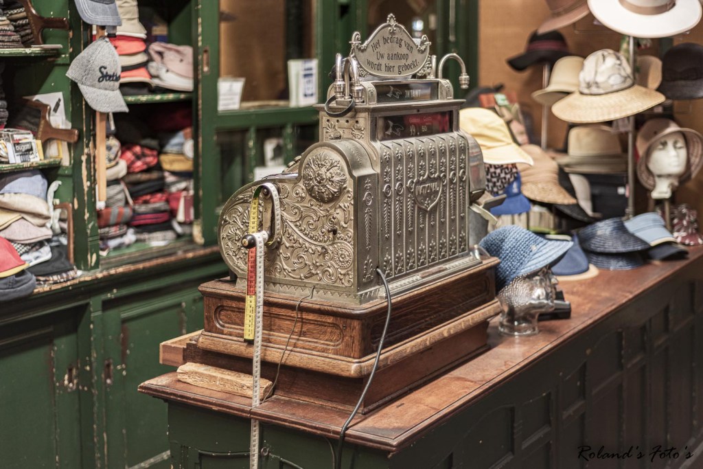 Alles ademde historie uit. Kort na binnenkomst werden we aangesproken door de verkoper. Wouw, wat een prater is die man. Binnen no time wisten we de complete historie van de middenstand in Groningen en dat hij één van de weinige winkels is die alle stormen heeft overleefd. Ik vertelde hem het doel van mijn bezoek. Ik wil graag een pet die mij past, maar mijn hoofd is te groot voor standaard hoofdeksels. Meneer ging even naar achteren en kwam met een stapel petten, die ik ook echt leuk vond, en die moest ik maar even passen. De eerste die ik opzette zakte tot ver over over mn oren. “Zo, we hebben dus even vastgesteld dat je a) helemaal geen groot hoofd hebt, b) er zijn wel petten die jou passen en c) je bent op het juiste adres voor het juiste hoofddeksel.