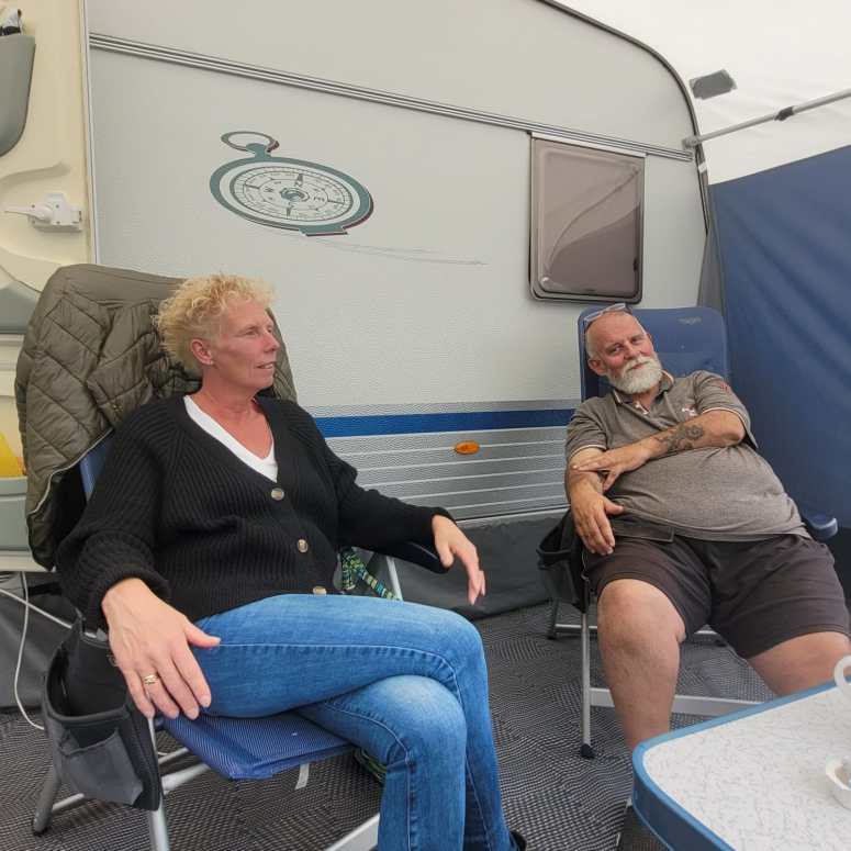 Zondag 23 juli eerst een beetje uitgeslapen. Want geloof mij, door alle indrukken, alle emoties, én…. door de kou waren we zo moe. Maar goed, ontbijten en hup… aan het werk. Gelukkig is Selma een professioneel koffer-inpakker. Dus dat was zo klaar. En we hadden de caravan mooi bijgehouden. Het is ook zeker niet de grootste, dus ons huisje voor (bijna) 3 weken was ook zo schoon. Alleen die regen…. de voortent zo goed en zo kwaad als het ging schoon gemaakt. Gordijntjes er vast er af. Gas al vast afgesloten. Tja, en meer konden wij eigenlijk niet doen. Hé kijk nou…. visite.