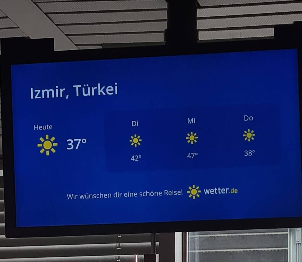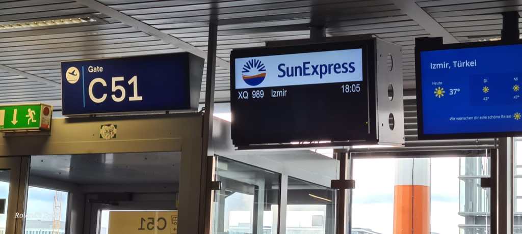 Nou, en toen konden we vertrekken…. of toch niet? Nee, natuurlijk niet. Je weet toch, bij ons gaat het nooit normaal. Dus er was een passagier zoek. Die was wel volledig ingecheckt maar had (nog?) niet geboard. En dan mag het vliegtuig niet weg. Uiteindelijk heeft de gezagvoerder het besluit genomen dat de bagage van die passagier dan maar van boord moest voor dat we konden vertrekken. Ach kijk…. volgende obstakel. Ook op Düsseldorf hebben ze problemen met personele bezetting. Dus er was geen personeel om de bagage van deze ene passagier uit te laden. Toen ze eindelijk handjes hadden gevonden hadden we al ruim 1 uur vertraging. Volgende probleem. Het tijdslot wat voor ons beschikbaar was, was reeds verlopen. Dus uiteindelijk mochten we met bijna 2 uur vertraging vertrekken. Maar omdat het laat was en rustig in de lucht konden we wat harden en kwam we veilig in Izmir aan met 1,5 uur vertraging.