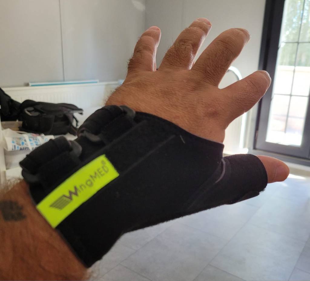 Nadat ik in de auto even weer was afgekoeld zijn we even via zo’n ‘Medische Hulpmiddelen Winkel’ gereden. Ik ben daar helaas ondertussen bijna kind aan huis. Zoals ik eerder had aangegeven heb ik een bot in mijn duim gespleten. De dokter heeft aangegeven dat ik minimaal 3 weken met een spalk moet lopen. (wel moet ik over 2 weken terug komen om te kijken of er al sprake is van genezing) Nu kunnen ze veel in het ziekenhuis maar een fatsoenlijke spalk aanleggen is er niet één van. Dus nu hadden we zelf maar wat gefabriceerd maar dat was vooral een hoop gedoe. Eens kijken wat ze voor mij konden doen in de ‘Medische Hulpmiddelen Winkel’.