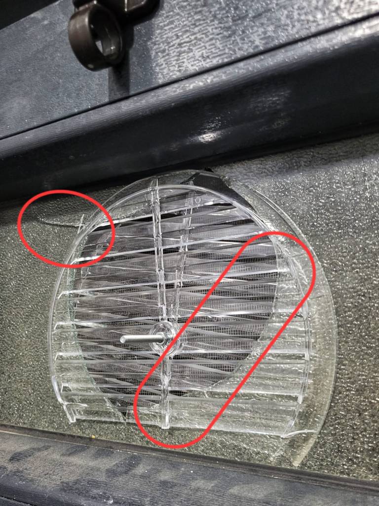 Maar goed, in dat raampje moest een rooster komen. Dat was verplicht al dus de installateur. En hij wilde dat wel voor ons doen. Hij vertelde nog dat als de inspecteur geweest was we het rooster wel weer kunnen verwijderen als we willen. (geen commentaar) Hij heeft een poging gedaan om een gat te snijden in het glas. Maar omdat dat van dat geribbeld melkglas is…. na een hoop turks gevloek had hij een ovaal gesneden en een barst in het raam. Daarbij paste het rooster niet wat hij mee had gebracht maarrrr…. we moesten het er maar mee doen. Immers dit zijn we verplicht om goedkeuring te krijgen. Man, ik ontplofte zowat. Toen heeft Selma mij maar even weggeleid, de topper. Want zij zag het helemaal mis gaan.