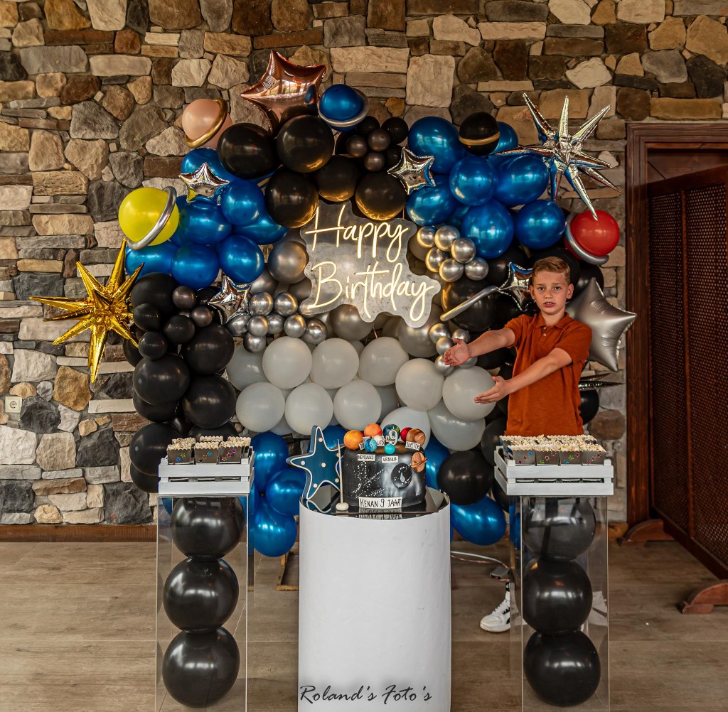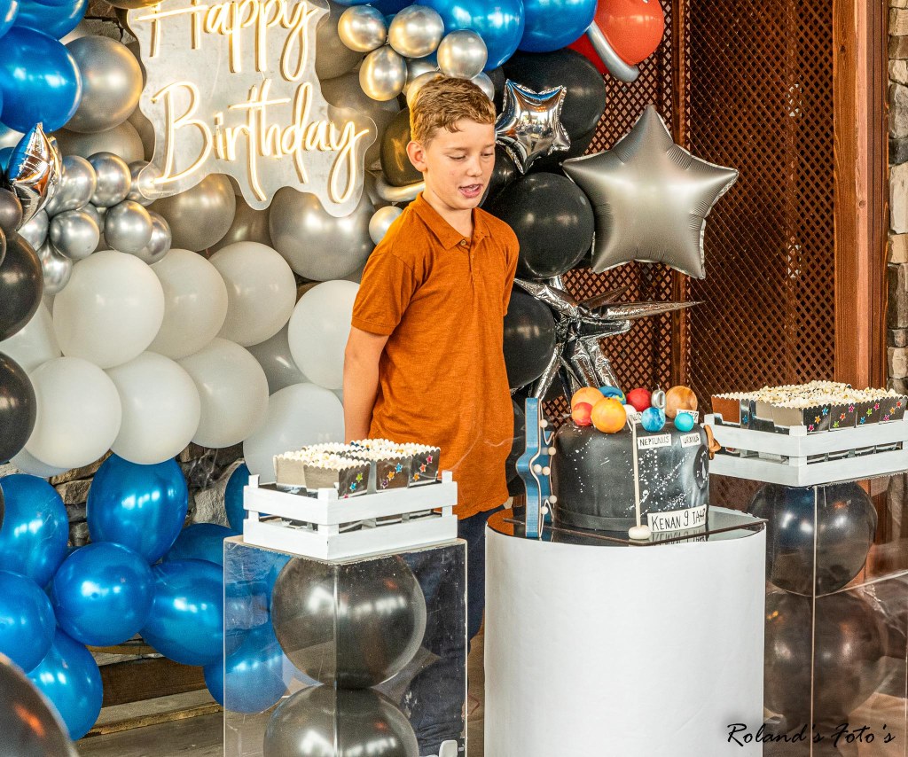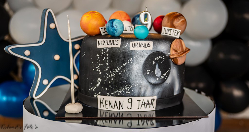 En toen we er aankwamen…. wouw, we waren onder de indruk. Kenan is helemaal fan van alles wat de ruimte betreft. Nou, dat hebben we geweten. Alles was mooi aangekleed met het thema Ruimte. Helemaal leuk! Uiteindelijk waren er 15 kindjes (even even zoveel mama’s). Lang verhaal kort…. het was een top feestje. Kenan zei aan het einde dat hij moe was en wel naar huis wilde maar dat het de mooiste dag van z’n leven was. En wat is ons mannetje verwend. Allemaal prachtige cadeaus. Van een telescoop tot een winterjas en van een hele grote puzzel van de ruimte tot aan een radiografisch bestuurbare Ferrari. En nog veeeel meer.