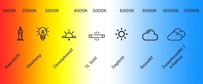 Verschillende lichtbronnen hebben verschillende kleuren, en dit wordt uitgedrukt in Kelvin (K), de kleurtemperatuur. Nu komt het verwarrende deel: hoe lager het Kelvin-getal, hoe warmer (oranje/roder) het licht eruitziet. Hoe hoger het getal, hoe kouder (blauwer) het licht is.